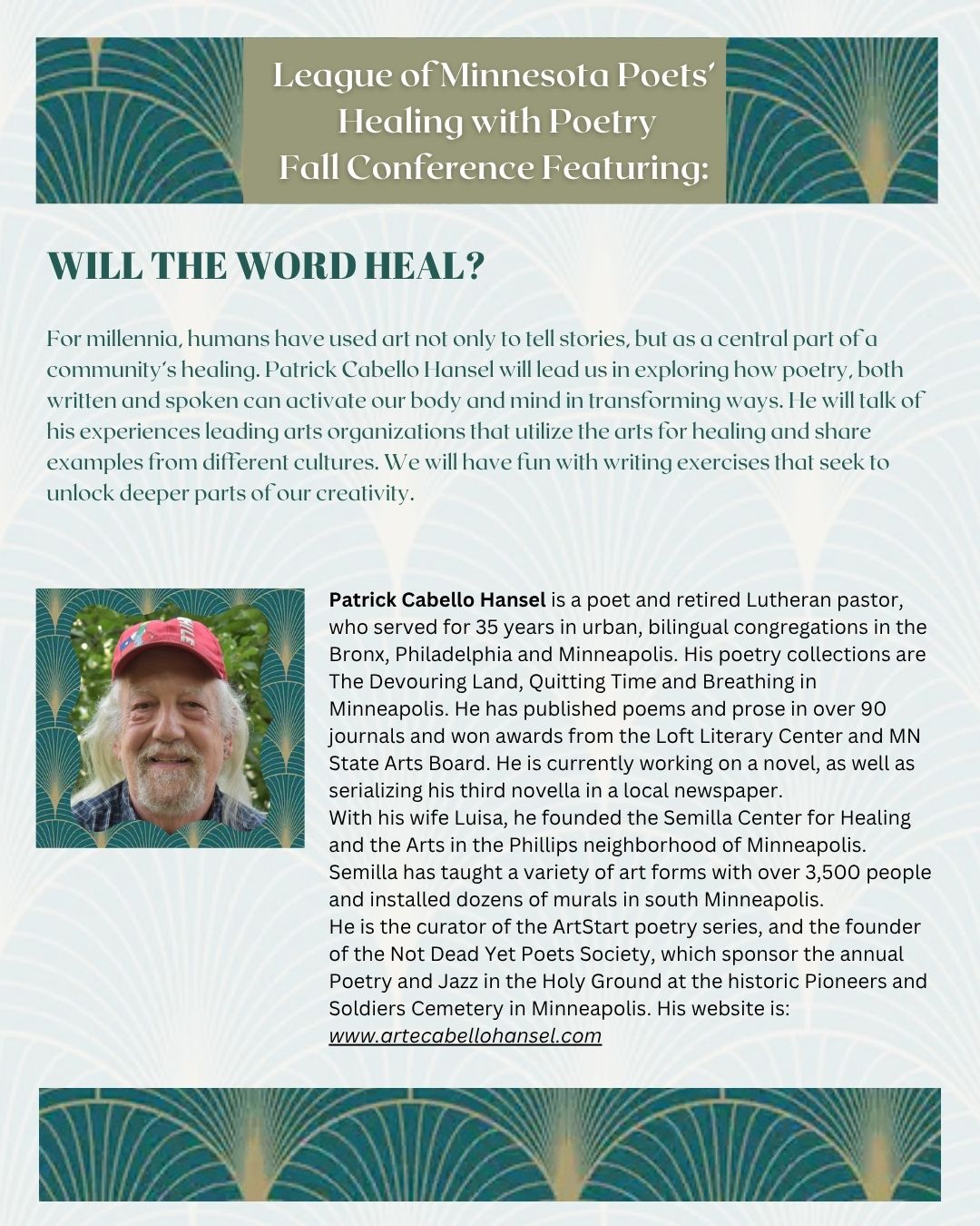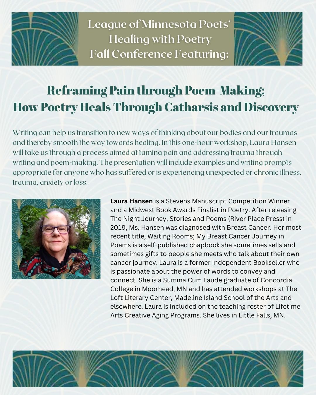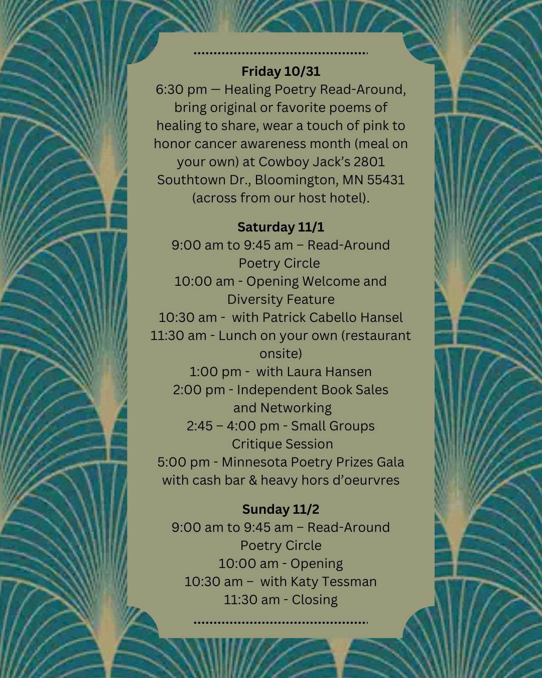 Click the button below to register for our Fall Conference and/or Minnesota Poetry Prizes Gala. Follow the blue links on the form to pay the correct amount.